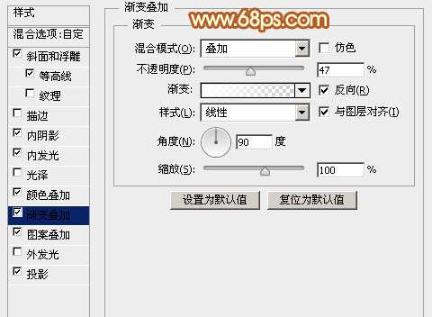 渐变叠加:渐变设置为白色至透明渐变,混合模式为"叠加",具体参数设置如下图。
