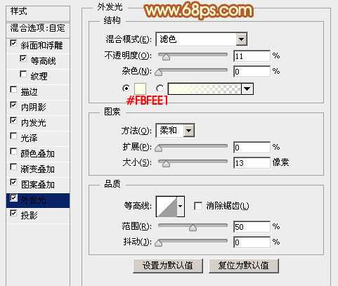 内发光:颜色设置为橙黄色:#e6b155,其它设置如下图。