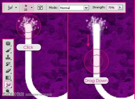 6、返回花火图层并点击,使用涂抹工具,选择软角,大小为20像素,强度70%,在每一个闪光的正中央按照图示方向涂抹。