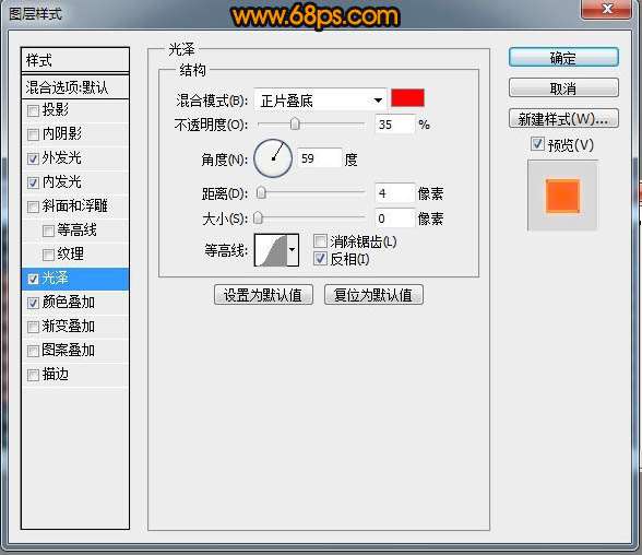 分别设置外发光、内发光、光泽、颜色叠加,参数设置如下图。