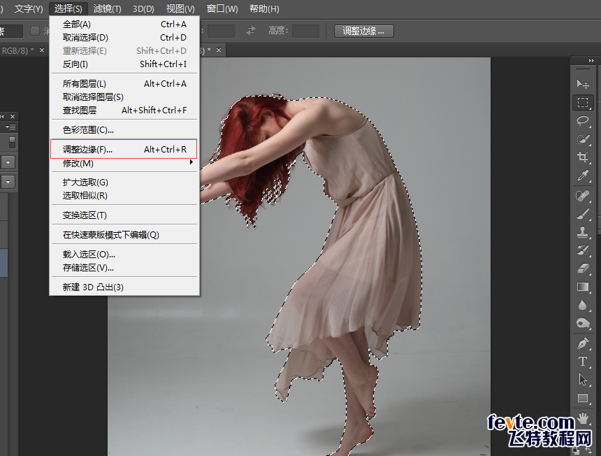 【4】扣图完了吧 很爽吧 哈哈!接下来找到选择下面的调整边缘,当然你也可以直接用快捷键alt+ctrl+r 完美跳转!