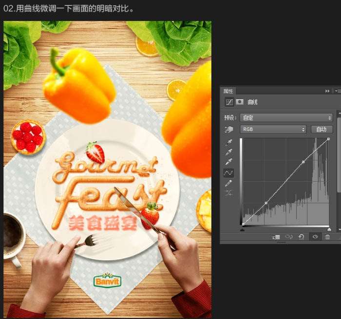 美食海报要体现食欲,所以颜色的搭配很重要。蓝色会让人没有食欲,它的对比色橙色会刺激食欲,所以食品海报用橙色的比较多。用第一人称视角的形式表现也会让画面更有代入感。最终效果