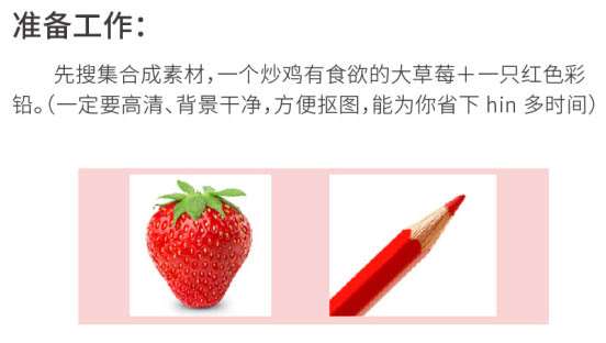 2、把草莓和铅笔分别拖到PS抠出来,抠完后拖到步骤1的新建文档里,分别命名铅笔图层。草莓图层。