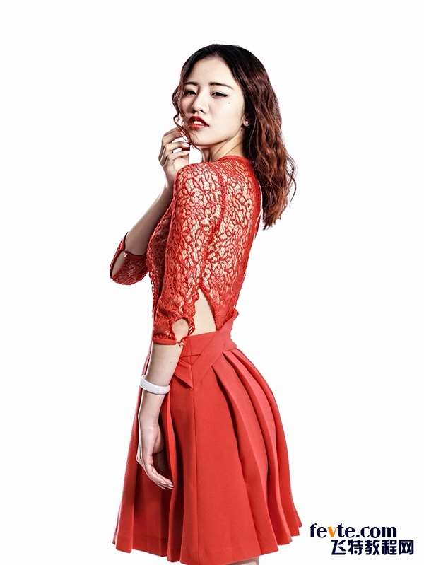 然后液化。修正一下模特的服装曲线,尤其是胸前那一块。同时也修正一下扁塌的发型,小小润饰一下脸部和腰部线条。这种液化要注意过犹不及,修得完全不像本人就不好了。一般为了避免液化影响到不想液化的部分,用冻结蒙版会好一点。