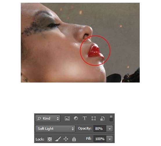 使用笔刷工具将图中模特的嘴唇涂红,混合模式选择柔光,透明度80%;