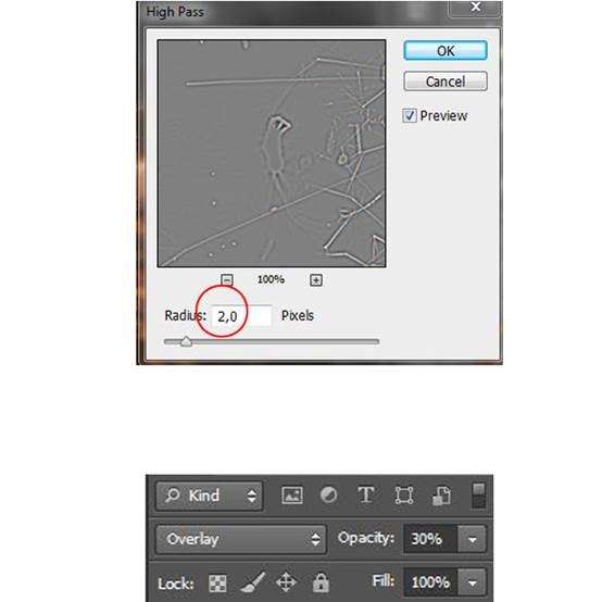 点击CTRL+SHIFT+ALT+E,新建一个包含上述所有图层内容的单独图层,然后滤镜 > 其他 > 高反差保留,半径设置为2 px,混合模式为叠加,透明度30%;
