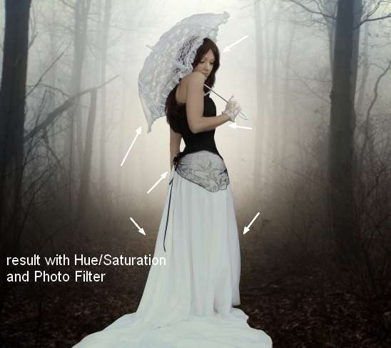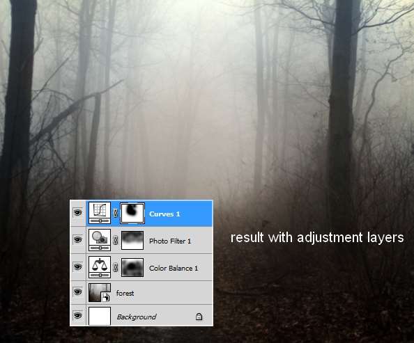 在色彩平衡图层蒙版,用黑色软刷从40-90 %的不透明度到油漆过的森林,揭示它的某些部分。你可以看到我是怎么做到的对图层蒙版和图片上的结果