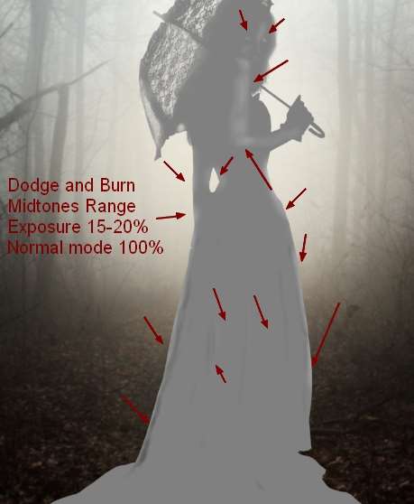 用减淡和加深工具( O)与中间色调范围和曝光约15-20 % ,以创造更多的细节模型的肌肤,提亮眼皮和礼服。你可以看到我是如何在普通模式下应用这个工具,并导致叠加模式: