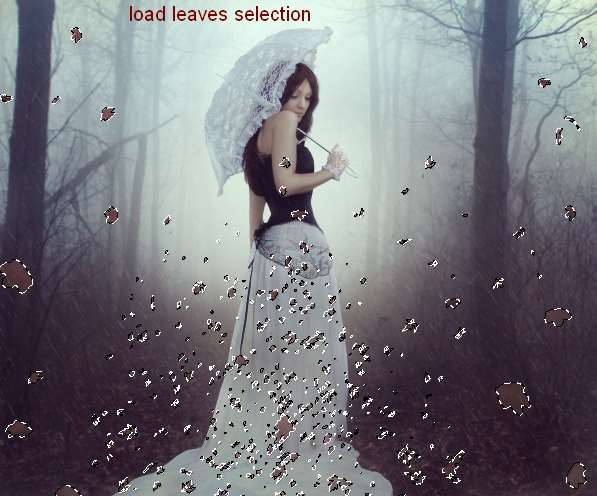 打开叶子包。选择一些部件和独立的树叶把周围的模型,并在道路上,如果需要,实现了随机效应使用变换工具(命令/ Ctrl + T键,倾斜,扭曲...... )和图层蒙版。我用35层的这种效果。放置一些较大的叶片附近的前景: