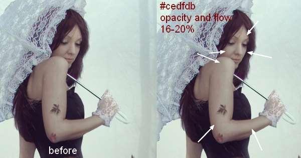 使顶部的另一层。用刷子刷颜色# cedfdb ,不透明度和流量16-20 %画上模特的脸和手臂创建一些光为这些方面