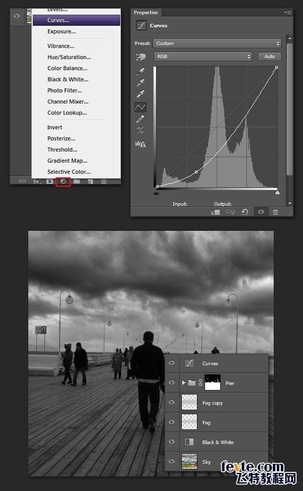 最后,创建曲线调整图层,使图像变暗,放在所有图层的最上面。