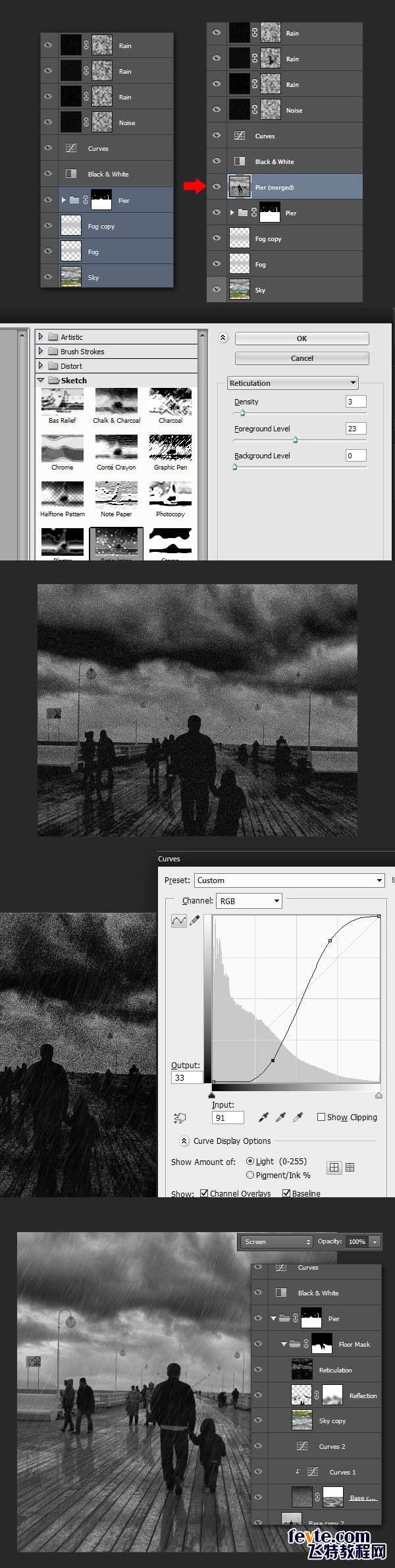 我们可以增加地板的质感。选择下面的"黑与白"层的每一层,复制和合并。使用网状滤镜(从滤镜>滤镜库>素描),按照下图的值。点击CTRL + M调出曲线面板,并增加层的对比了一下。最后,入在"Floor Mask"组中,并命名为"Reticulation"。