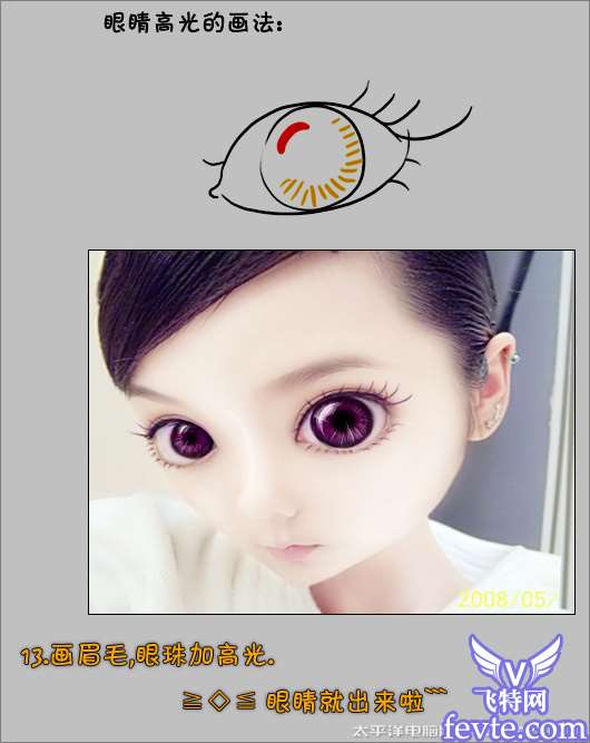 13、画上睫毛。可以网上下载睫毛笔刷或自己用钢笔画。接着在眼珠加高光,有神的眼睛就出来了。