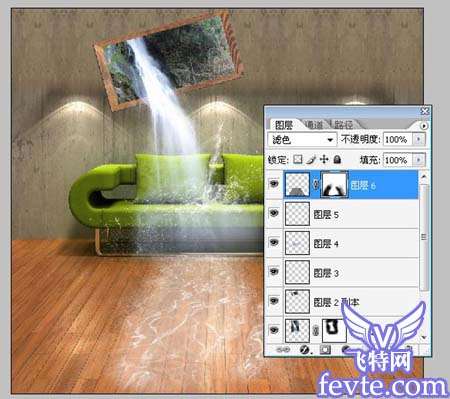 5、显示隐藏的瀑布图层,将图层混合模式设为"滤色",添加图层蒙版。