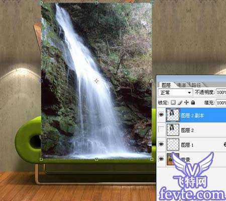 2、将瀑布素材拖入调整好大小并复制一个图层,将其中一个图层暂时隐藏(见下图)。
