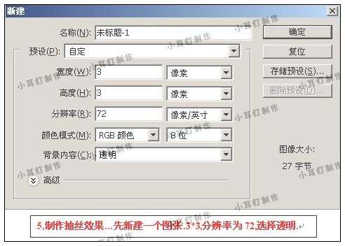 5、制作抽丝效果,先新建一个图3 * 3像素,背景为透明,参数设置如下图。