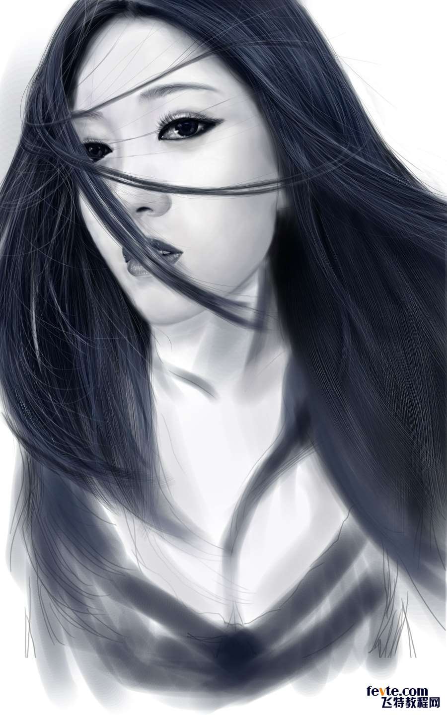 然后开始最困难最耗时间的头发。头发的方法从平到立体,从无到有。后面会说我自己琢磨出的画头发的方法