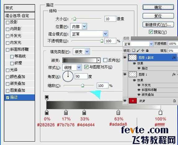 五、按下enter键取消变形工具,然后双击这一图层的缩略图,对出现的图层样式对话框中的描边进行如下调整,并将这一图层的填充调整为0.