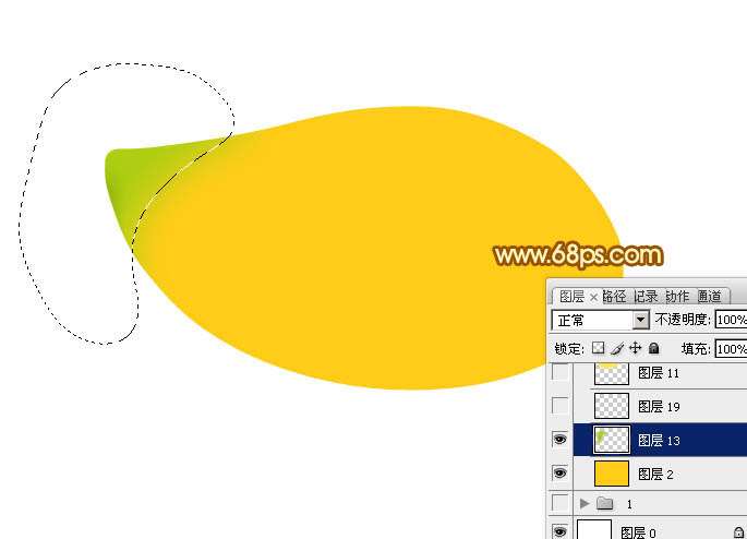 14、现在再来制作中间的高光区域。新建一个图层,用钢笔勾出下图所示的选区,羽化12个像素后填充黄色:#FFEB87,如下图。