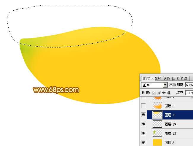 <图4> 5、新建一个图层,用钢笔勾出顶部的高光选区,羽化20个像素后填充淡黄色:#FFE74B,不透明度改为:60%,效果如下图。