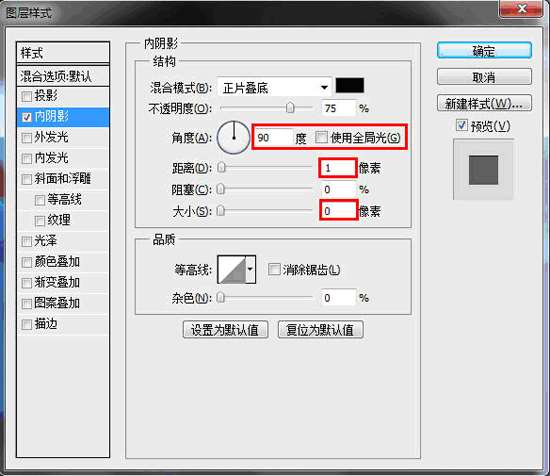 06 勾选特效窗口中的内发光选项,设置混合模式为正片叠底,不透明度为80,颜色为深蓝色,阻塞为10,大小为20,如图1-6所示。