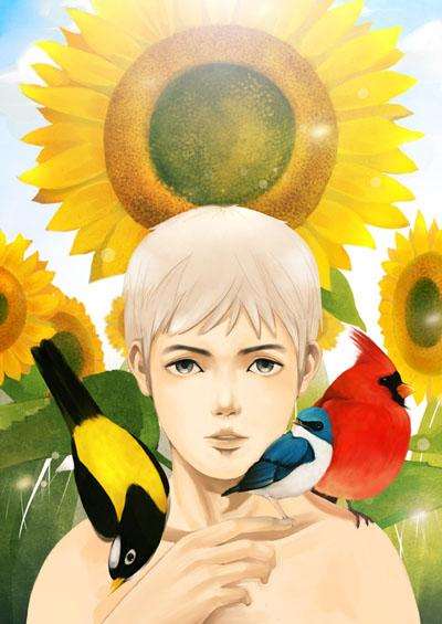 9、接下来是背景部分,笔者设想的是画在向日葵丛中。用PS大概的涂了下位置之后,又打开SAI起稿,铺色调,跟刚才的步骤异常的相似。