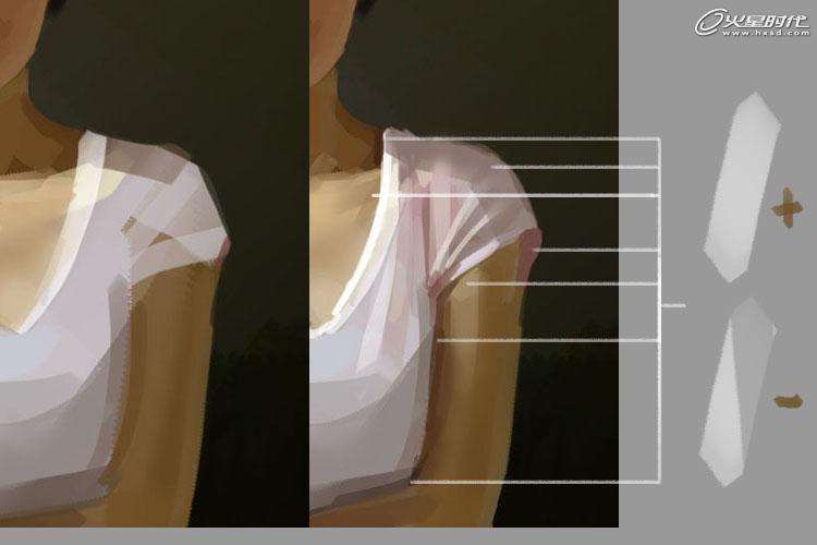 接下来是一个肩部刻画特写。首先,要少画多观察,笔刷采用加减的方式,也就是画一笔,擦一半,这样就有一个三角的笔触,这样很容易刻画衣服的笔触,也比较有层次。实际上刻画的地方只是物体接触的边缘,像衣服和皮肤接触的区域,在这块加了一个比较明显的紫色。感觉比较透一点。