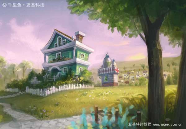 11.第四步:后期调整。 后期调整是个不断对比着前进的过程。一张图往往快画完了还会有各种问题跳出来,PS强大的调整功能可以弥补这一切。但有调好的时候,也有调过头的时候,我经常会通过历史记录,进行反复比较,然后在比较的过程中精进。 有朋友认为画面右边的树太挡视线了,把它移开些可能会让视野更开阔,我试着改了下,效果是好些,我采纳了他的建议,并且利用挪开的空间把小洋楼后面的牧场画的更精彩了。