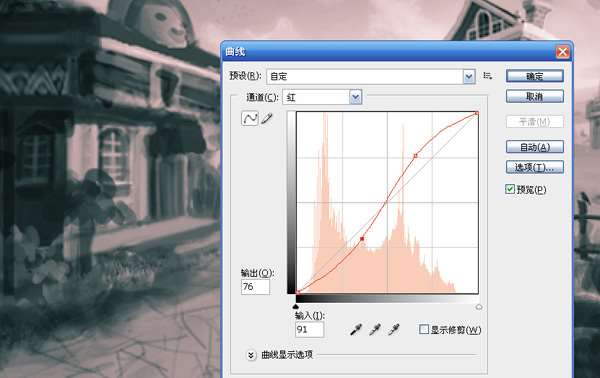 3.黑白稿完成了,开始上色。 第一步:用曲线工具调整整个画面的冷暖关系。 这张图我准备画成夕阳西照的感觉,亮部会明显的偏暖,暗部则偏冷。于是我用曲线工具,对红色通道做了以下调整。