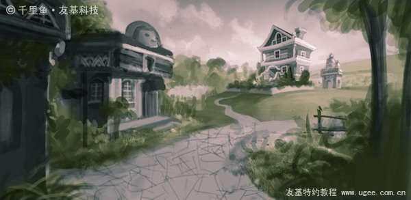 8.颜色大致就上好了,整个村子在我脑海中呼之欲出。休息一下,开始第三步。 第三步:分重点区域细画。 重点区域,就是整张图重要的几个看点。当一张图要表现的东西比较多的时候,我喜欢把重点要表现的几个区域裁减出来细画。因为裁减后的图较小,不会有太多潦草的东西扎眼,我可以耐心地把重点画细致。当然要注意在裁减边缘处不要做改动,以免拼接回去不方便。 这张图我裁减出了三个区域,就是远景的小洋楼区,中景的便利商店区,以及近景的花丛区。接下来我将以小洋楼区域为例说明一下细画的过程。 首先,我把颜色冷暖变化的原理继续贯彻,甚至更夸张明确地表达出来。这时我想向大家推荐叠加属性的笔刷,这种属性的笔刷在提亮颜色上有事半功倍的效果。