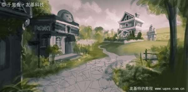 15.几天以后,我重新审视这张图,发现左边两栋房子中间的小路不太合理,于是我把它去掉,取而代之以茂盛的花草,并将左边小屋的结构做了调整,让它看起来更科学更有情调。当一个东西放在画面边角不重要的地方时,我们常常对它不够用心,实际上它的剪影也能给观者带来更宽广的想象。另外,我感觉小路上的树影不够明确,于是我给树影做了选区,对它的形状进行了更加明确的概括。好的,一张满意的图终于跃然眼前啦!