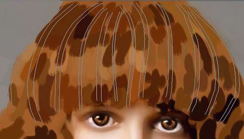 20、涂抹之后的大概小效果,我观察了一下,右边的卷发色彩太少,现在应该先处理右边的卷发。而且头发的层次感很差。