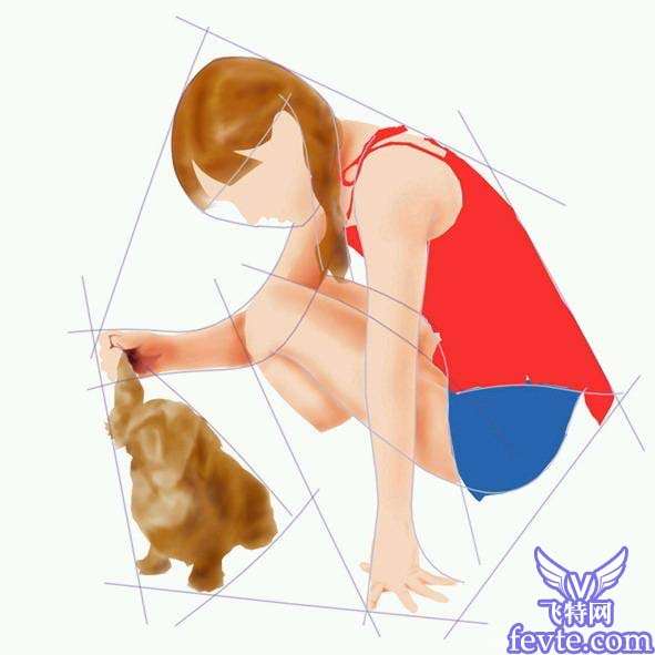 现在观察一下原图,要分好多图层来画。我先从头发入手,顺便把小狗的毛发也带上。在辅助线图层的下面新建一个图层命名头发(辅助线图层要放在最上面),用多边形套索工具勾出外形,选择头发色中的中间色,用油漆桶灌,在使用减淡和加深工具粗略涂上明暗。小狗毛发也一样。