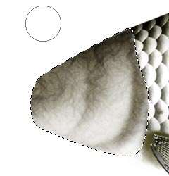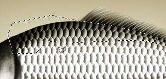 35、选择“鱼身”层,用“多边形套索工具”(快捷键L)在鱼身上半部分建立一个选区,并羽化10个像素,如图6.2-43所示。