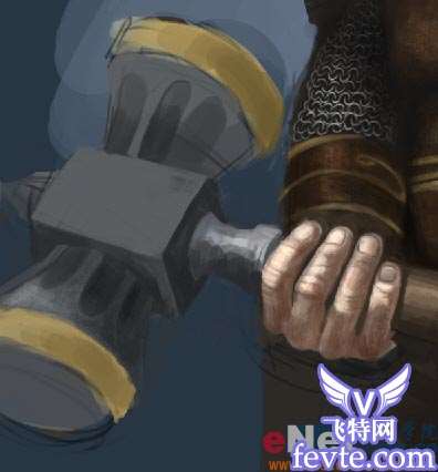 21.完善手指部分的绘制,使用圆头画笔画出更多的转折的关系丰富形体,在画的时候要将手指部分的结构表达出来,用较亮的颜色画出受光部,加深手指与锤柄的接触部分。
