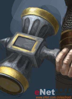 23.先用粉笔笔刷为锤头的表面添加质感,然后再用圆头画笔深入塑造,画出锤子表面的结构,将上部锤头向下移动些,然后用粉笔笔刷选择高亮的颜色添加亮部