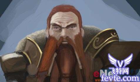 8.使用亮黄色画出金属装饰物的高光,突出金属质感的感觉。接下来是身后的披风,缩小画笔的大小,画出披风的皮毛,笔触不要太规则,并且要服从披风整体的明暗,在披风的边缘部分可以画出去一些以增加毛制的感觉。