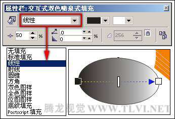 (4)保持椭圆图形的选择状态,使用"交互式填充"工具,在其属性栏内"填充类型"下拉列表中选择"线性"填充类型,这时椭圆形将被默认填充为从黑色到白色的线性渐变填充,如图4-49所示。