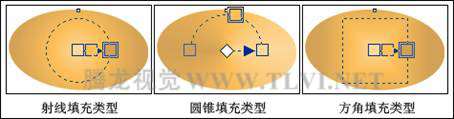 此外在"渐变填充方式"对话框中,"类型"下拉列表中还为用户提供了"射线"、"圆锥"和"方角"填充类型,读者可根据绘图的需要灵活运用。图4-56分别展示了其他渐变填充类型的填充效果。