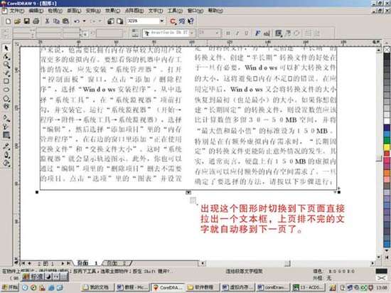 2、段落文本连排(说法可能不专业,别见笑啊):由于corelDRAW不能像freehand那样可以将所有的页面显示在同一个作业窗口中,而是一个页面一个页面的显示。这就给我们进行多页面画册的排版带来一定的不便,但习惯了也就好了。但如果有较长的文章一个页面排不完,需要延伸到下一个页面,这时就要使用"段落文本连排"功能了。方法:点击文本框下部中间的小方框,出现一个小方框带个向右下的箭头时切换到下页面直接拉出一个文本框,上页排不完的文字就自动移到了。如果你缩小的文本框,里面的文字会随之移到。这种功能是不是很好呢?多试试吧。如图13 另外请注意:如果文本框下部中间的小方框是空心的,表示这段文字已结束;如果小方框里带一个向下的小三角,表示这段文字还有一些内容隐藏起来了。