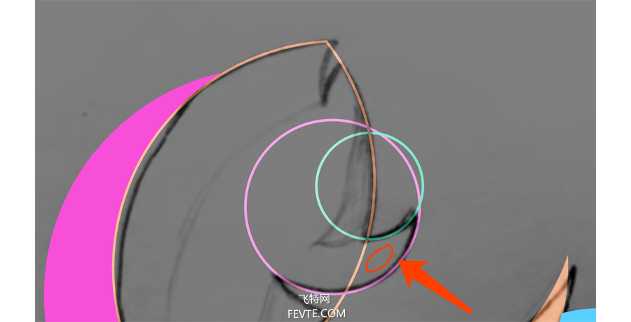 6.a 加点细节,如图所示,继续用圆来做,图中箭头部分用形状生成器划一下。重点来了,选中我们要的这部分,ctrl+x(剪切)然后ctrl+z撤回,撤回到鱼的整形,没有圈圈,最后ctrl+F(复制在上层)