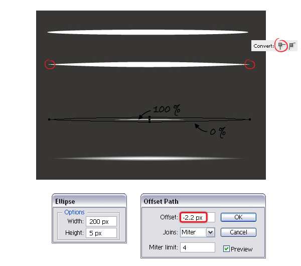 创建一个大一点的混合画笔,你就要先画一个大一点的椭圆。这次画一个200 x 5px的椭圆,还是填充白色。和之前一样,将左右两边锚点由圆滑改成边角。现在打开对象>路径>偏位路径,应用-2.2px的位移值,在中间得到一个小一点的形状。设置大的椭圆不透明度为0%。接下来,同时选中这两个形状,打开对象>混合>建立(Alt-Control-B),默认值,你会再次应用同样的设置(25指定步数)