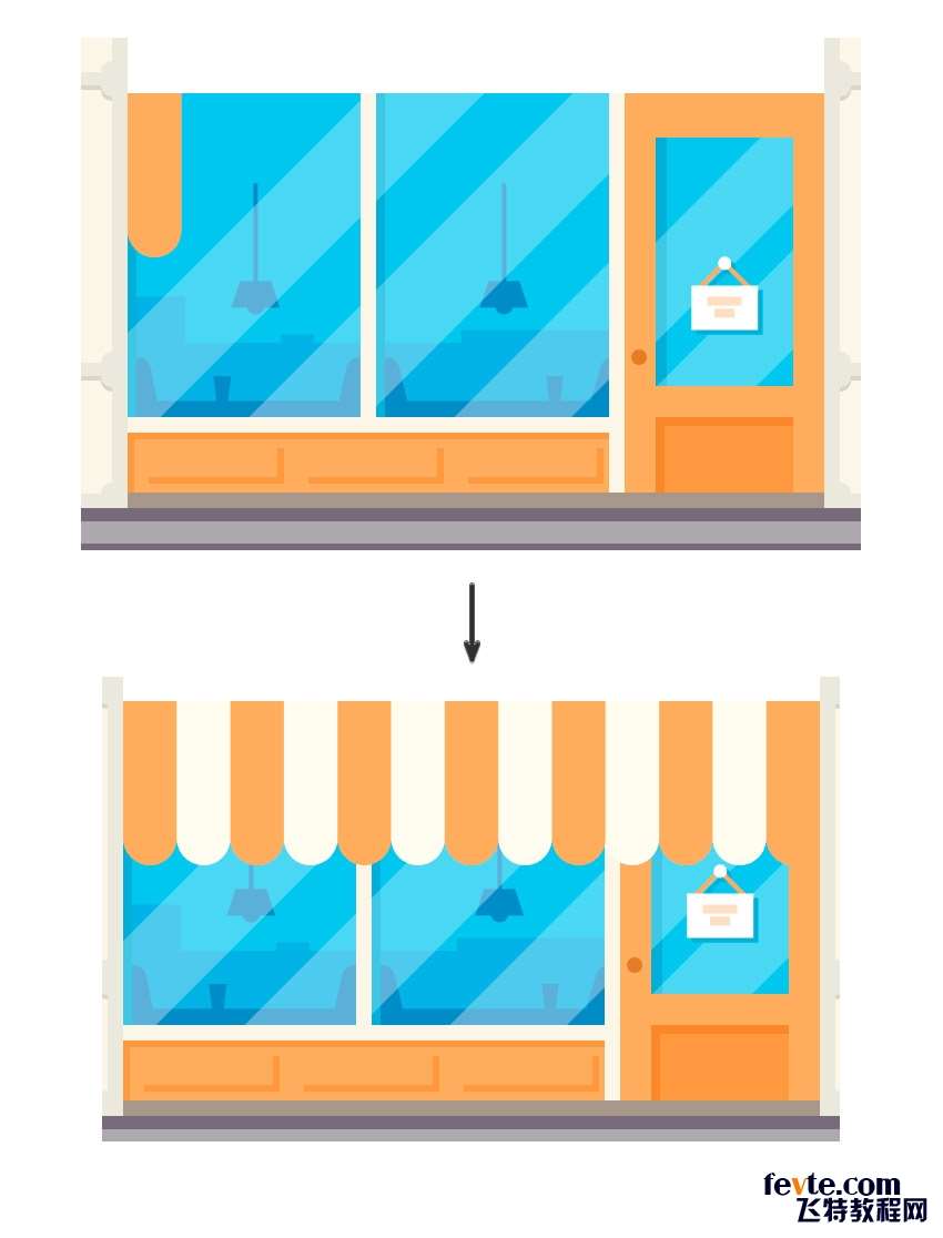 6)给门上装个把手。7*7px,颜色为#BB7B33。然后画个224*27px,颜色为#EAAB61的矩形作为正面的墙,接着画个224*153px,颜色为#78C4ED的矩形作为大的橱窗。同样的方法给正面的墙做个阴影。颜色为#DB9747。