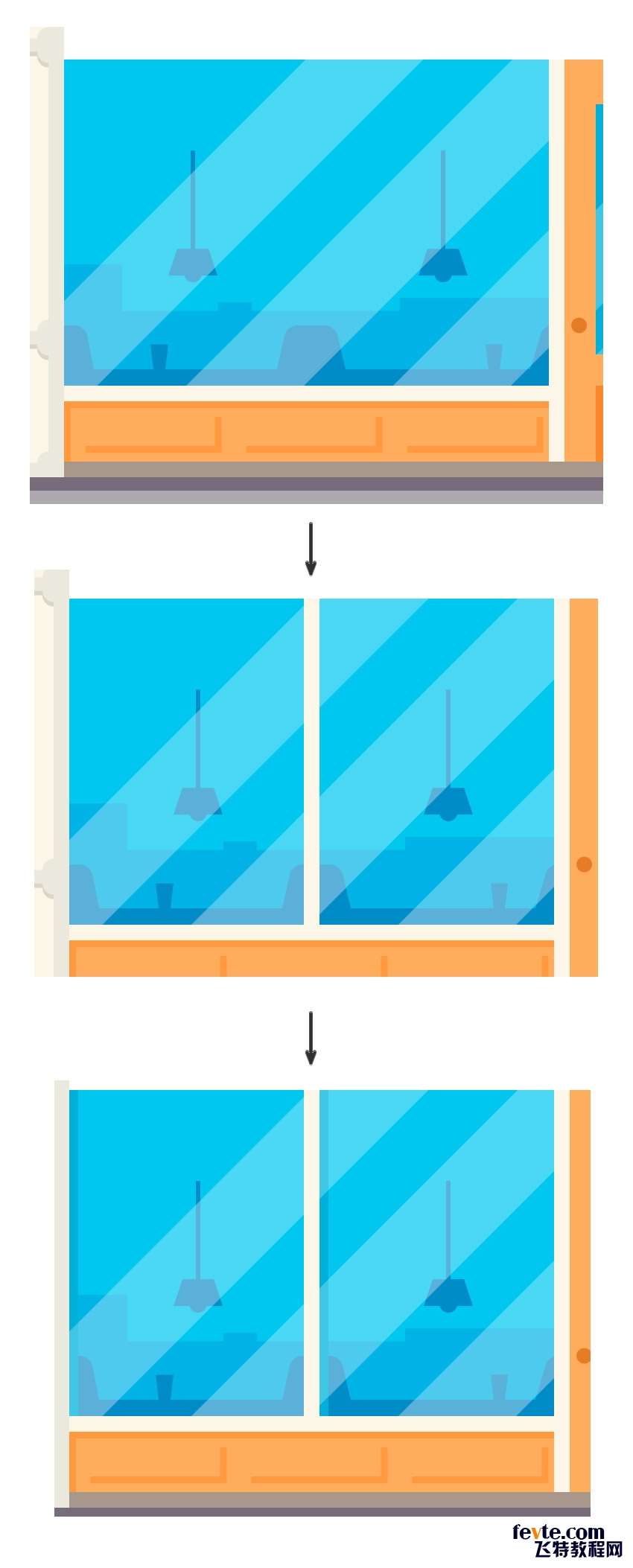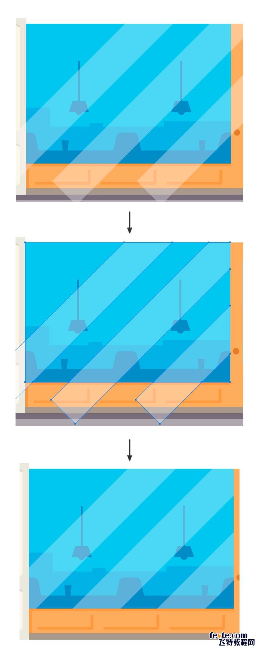 4)新建一个62*112px,颜色为#78C4ED的矩形(门上的玻璃),然后添加一个5*112px,颜色为#64ABD5的矩形作为阴影。接着画几个白色的矩形,旋转45度,改变不透明度(玻璃上添加高光)为30%,利用形状生成器工具减去多余的部分。