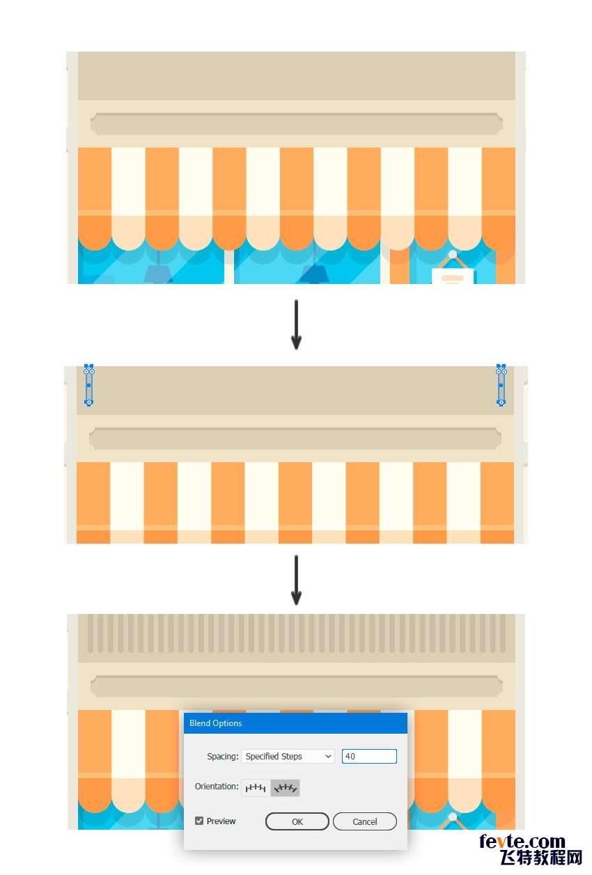 13)接着画一个颜色为#EAAB61的矩形,盖过挡蓬就行。选中它们,使用形状生成器工具剪掉我们不要的。改变混合模式为正片叠底,不透明度为35%。然后再加一条314*4px,颜色为#FFFDEF的矩形。同样混合模式改为柔光,不透明度改为50%。