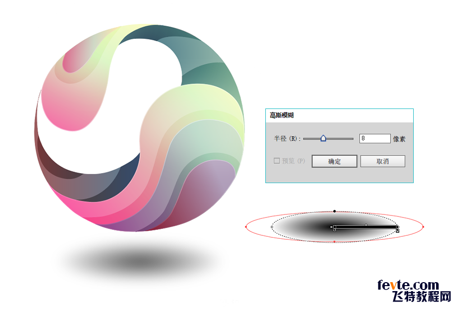 到了这一步整个球体就绘制完成了,这时我还可以给它增加一个投影,让立体感更突出。绘制一个长形椭圆,椭圆填充一个径向的黑色渐变(黑色从透明度100%过渡到0%)。给这个椭圆运用高斯模糊,模糊半径为8,将透明度降至68%。
