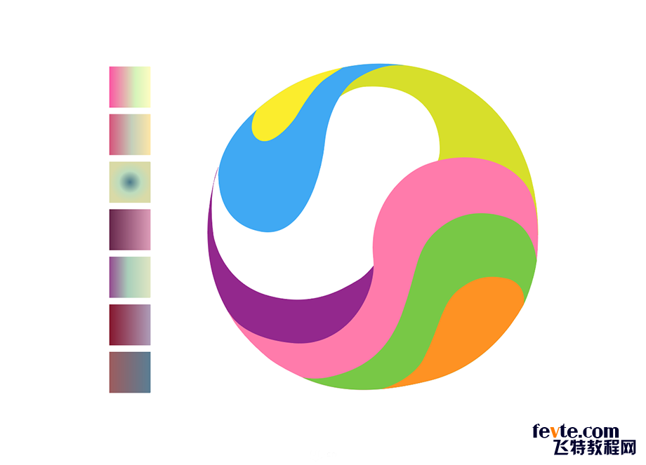 对球体的配色我们选择的是渐变配色,渐变的颜色会让整体效果显得更立体,但是这里一定要控制的渐变里的色彩搭配。在这个案例中,我想用的渐变色并不一定要根据实际情况,而采用一种幻想式配色。按照真实的球体来说,它的表面渐变是具有一定规律的,但在此我想打破这个规律,变得较为梦幻的自由自在式。