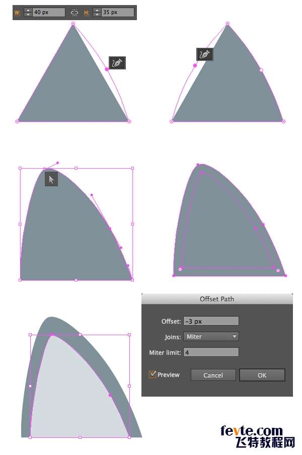 选择上方的锚点,使其顺滑并向左拉动一点,使形状倾斜。 转到对象>路径>偏移路径,并设置偏移值为-3px,形成耳朵的内部。 用浅灰色填充。