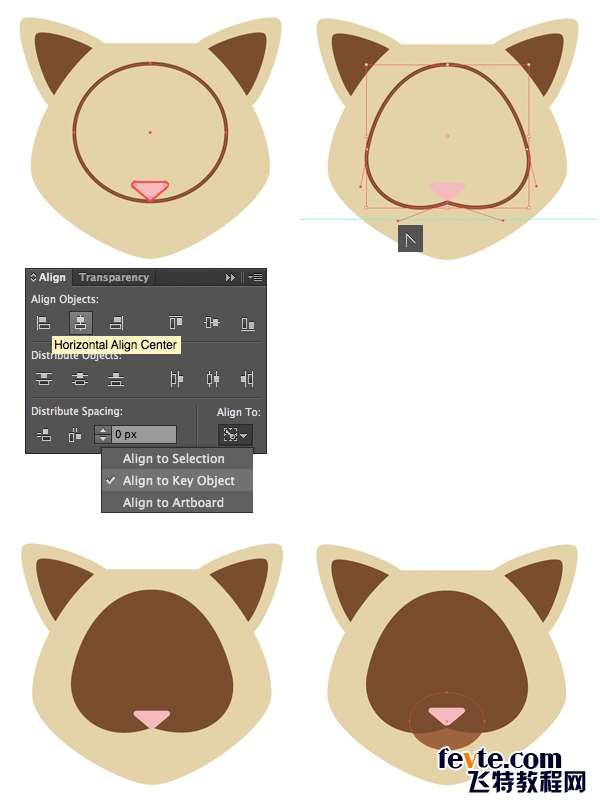 利用鼻子作为一个关键对象,将椭圆对齐到鼻子上。 要做到这一点,需要选择2个形状并按住Alt键时点击鼻子形状。 你将会在鼻子周围看到一个厚厚的描边,指示关键对象。 前往对齐面板并点击水平居中对齐。