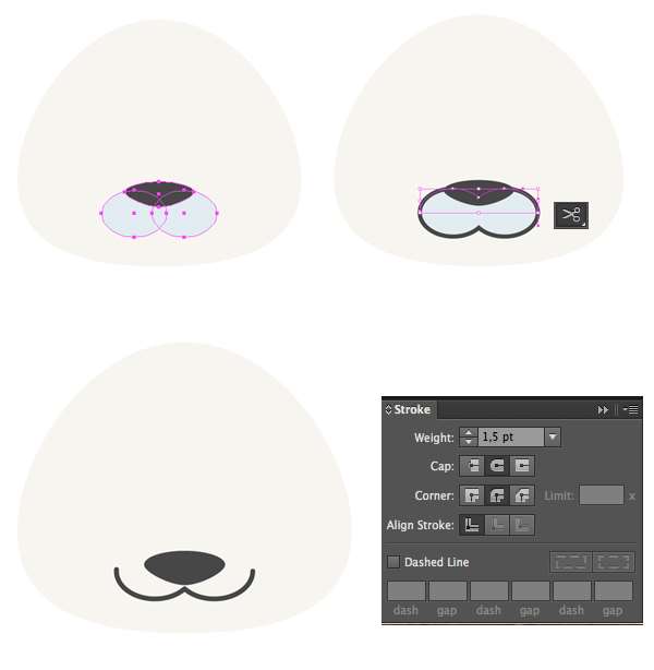 从我们狗的图标复制鼻子区域,并设置描边的颜色,嘴唇为深灰色,以便轮廓不可见。 选择2个椭圆轮廓(没有鼻子),并在路径查找器中将它们合并。